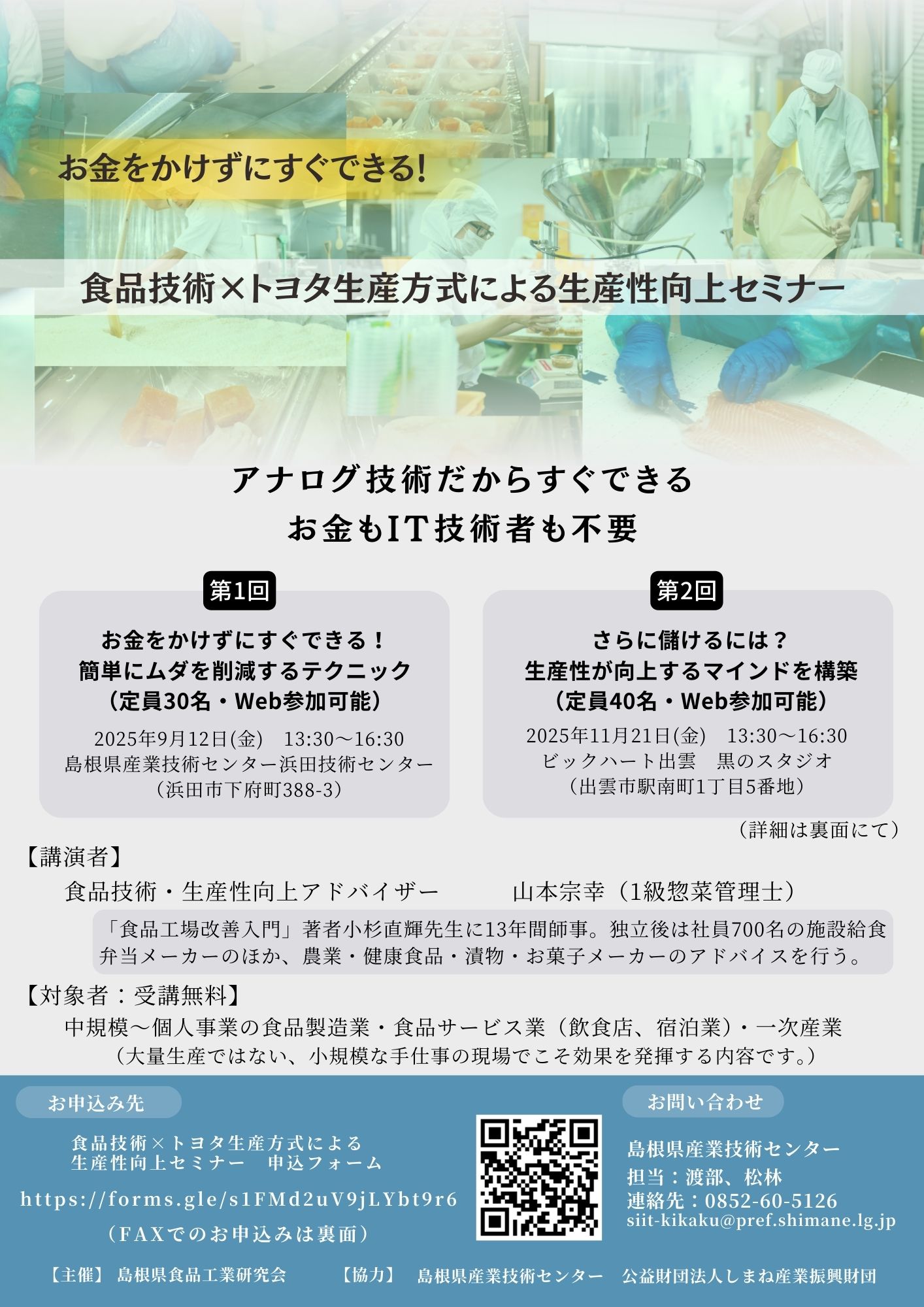 島根県の食品製造業の生産性は、県別で比較すると最も低いグループに属します。しかし、これは裏を返すと「伸びしろが大きい」&「多くの可能性がある」とも言えます。カイゼンは、特別な設備や専門知識は不要です。講師がこれまで手がけてきた事例やモデルをもとに、誰でも実践できる手法をわかりやすく解説します。